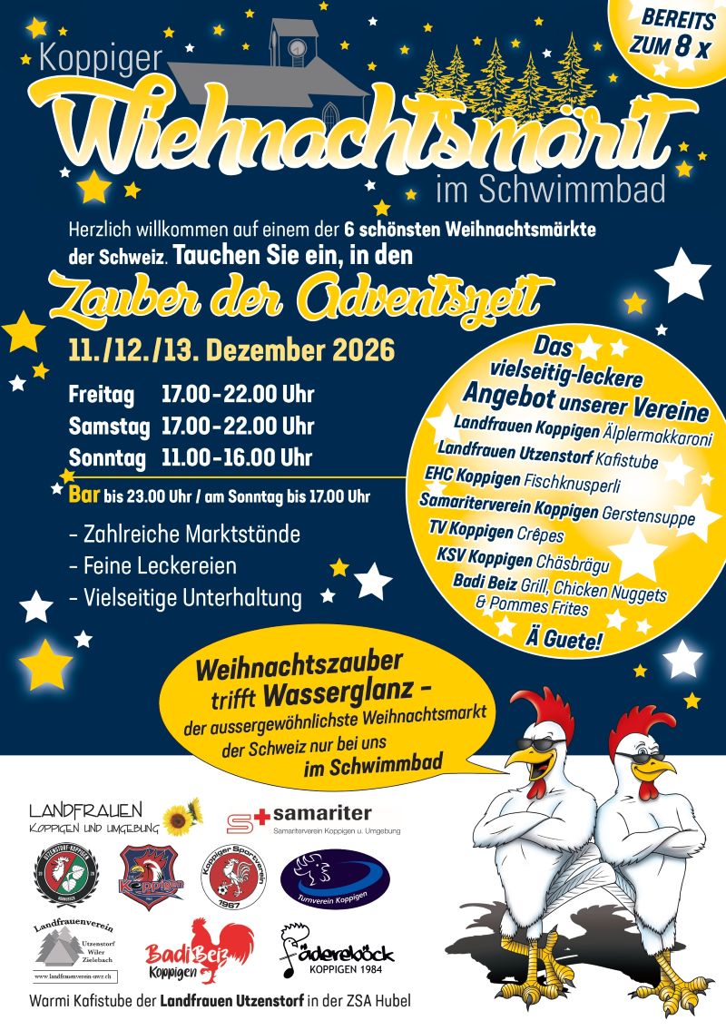 Hereinspaziert und herzlich willkommen zum achten Wiehnachtsmärit im Schwimmbad Koppigen. Am Freitag, 11. Dezember 2026, öffnet der Koppiger Wiehnachtsmärit wieder seine Tore. Auch für die diesjährige Ausgabe haben sich die Veranstalter wieder einiges einfallen lassen. Mehr als 100 Stände sorgen für ein vielfältiges Angebot. Lokale Handwerkskunst aus Holz und Metall, hausgemachte Leckereien, Stoffkreationen oder Schmuck warten auf die Besucher. Wer sich lieber den kulinarischen Freuden widmet, ist ebenfalls bestens aufgehoben. Wiederum, und das ist eine der Stärken des Koppiger Wiehnachtsmärits, beteiligen sich die lokalen Vereine und Institutionen aktiv mit Ihren Darbietungen und Verpflegungsständen und geben dem Markt seine typisch familiäre Atmosphäre.